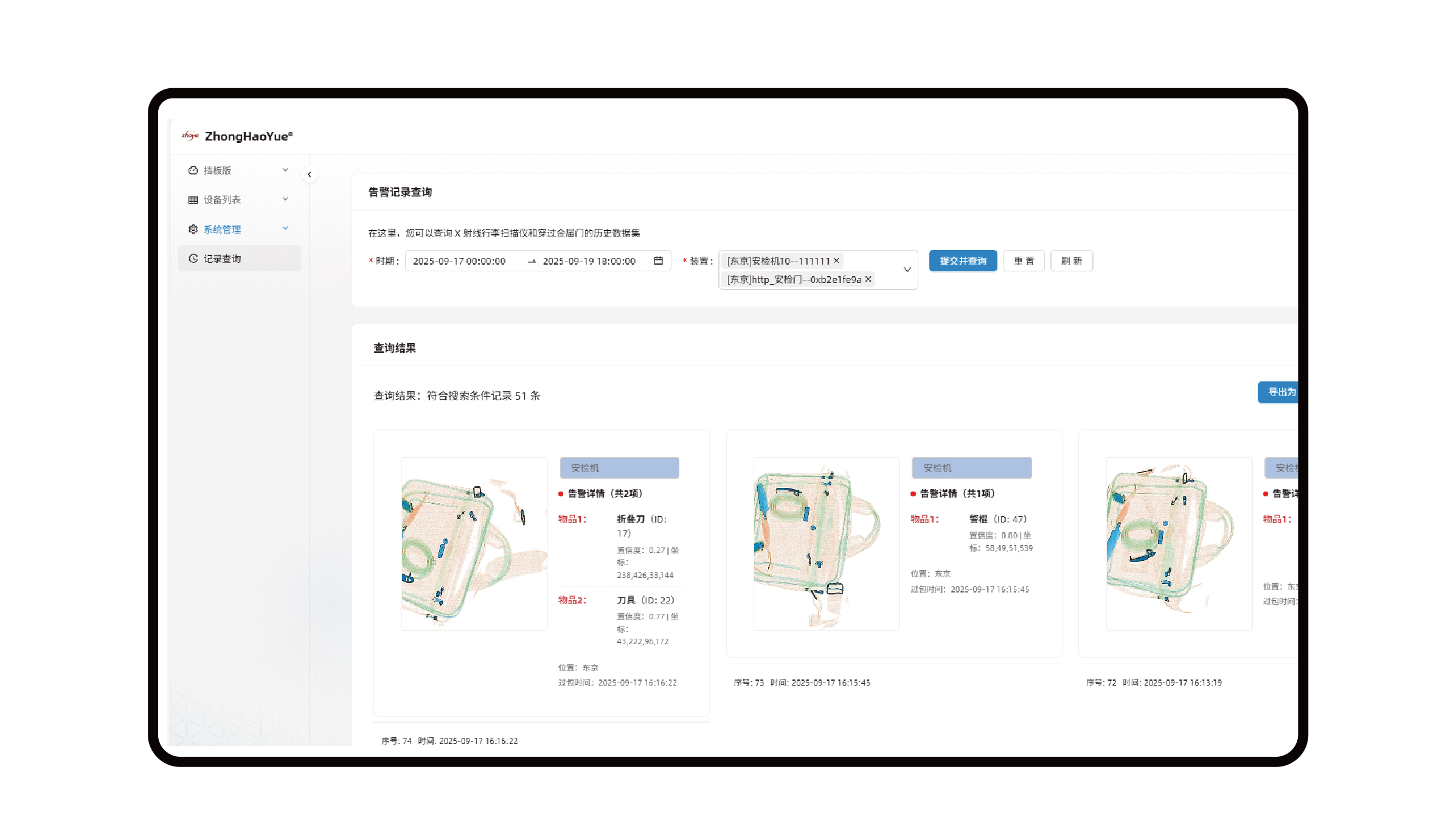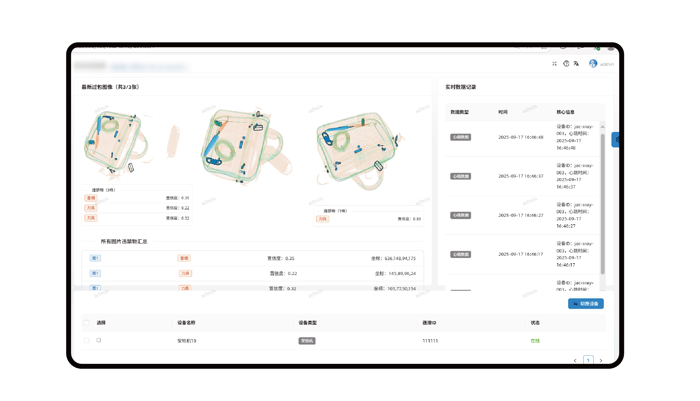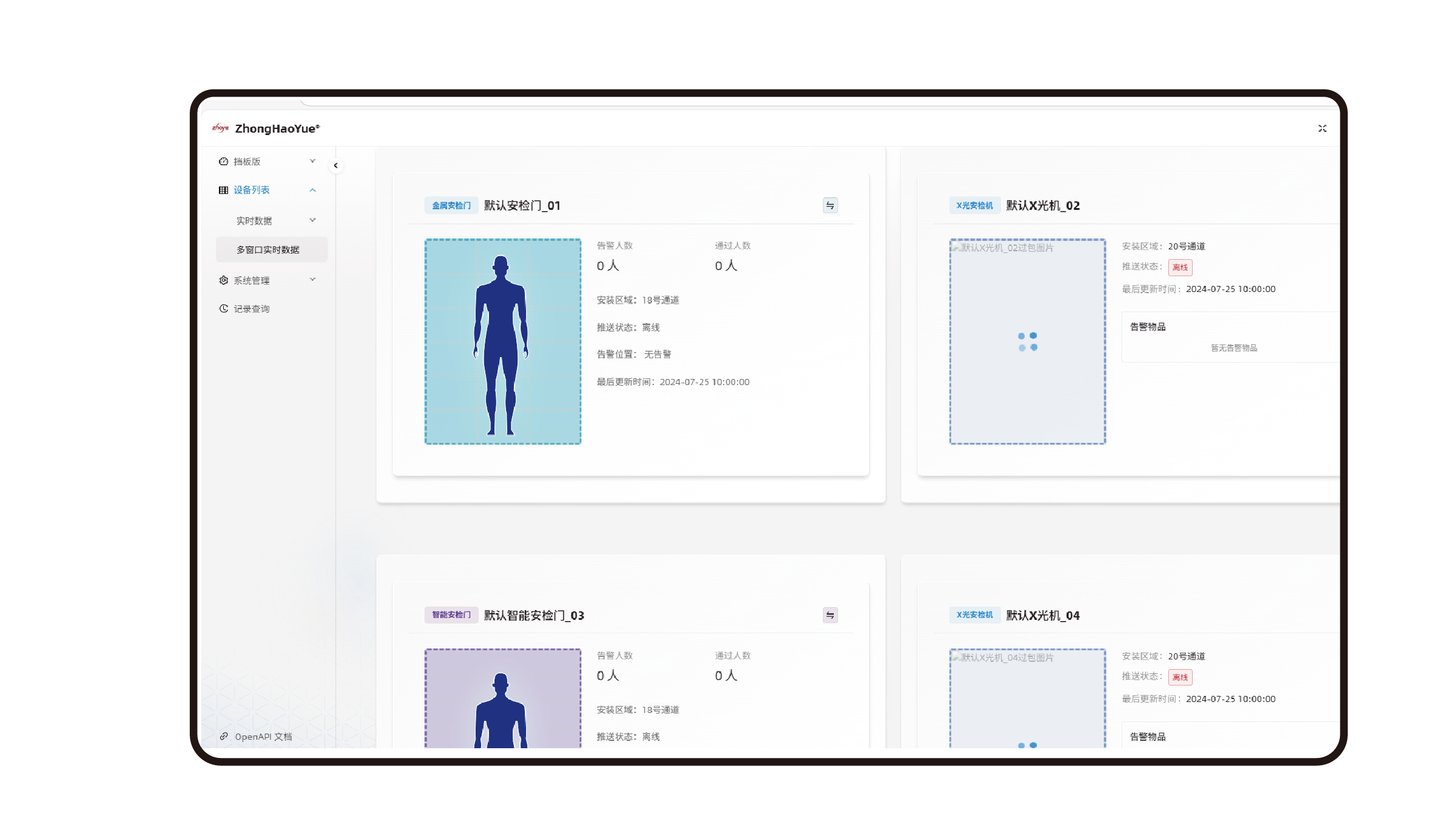 系統涵蓋多個核心模塊:通過安檢數據可視化大屏實現多維度數據(告警態勢、設備狀態等)的直觀呈現;依托安檢機、安檢門實時監測模塊,支持過包圖像解析、違禁品識別、人員安檢數據實時統計與詳情展示;借助多設備實時數據概覽模塊實現多類型設備狀態與業務數據的集中化聚合管理;同時,通過用戶管理、角色管理實現精細化權限管控,通過區域管理提供基礎數據支撐,通過日志管理保障操作可追溯,通過設備管理實現安檢設備全生命周期管控,通過告警記錄查詢支持歷史告警的多維度篩選與追溯分析。
