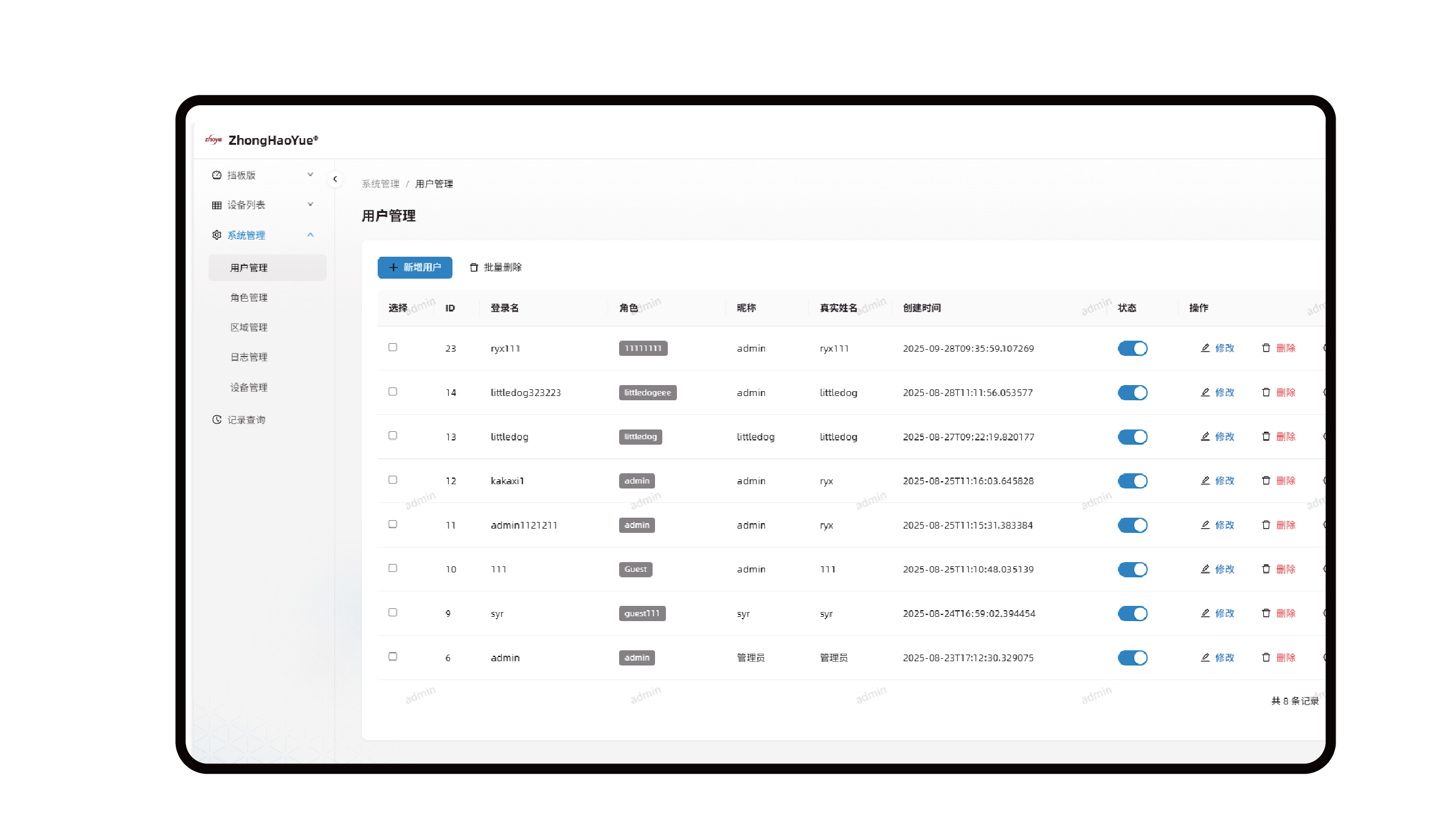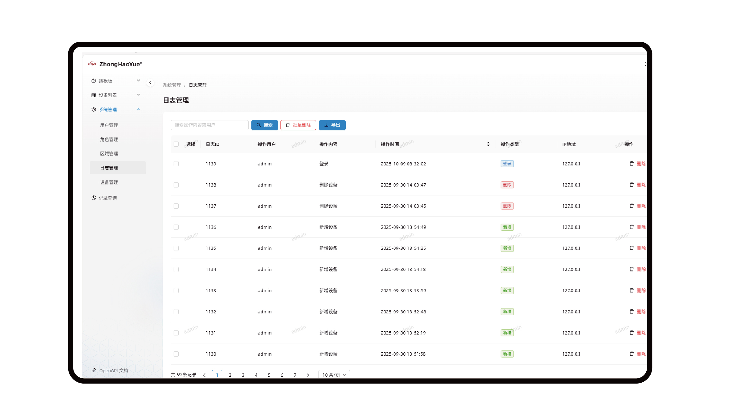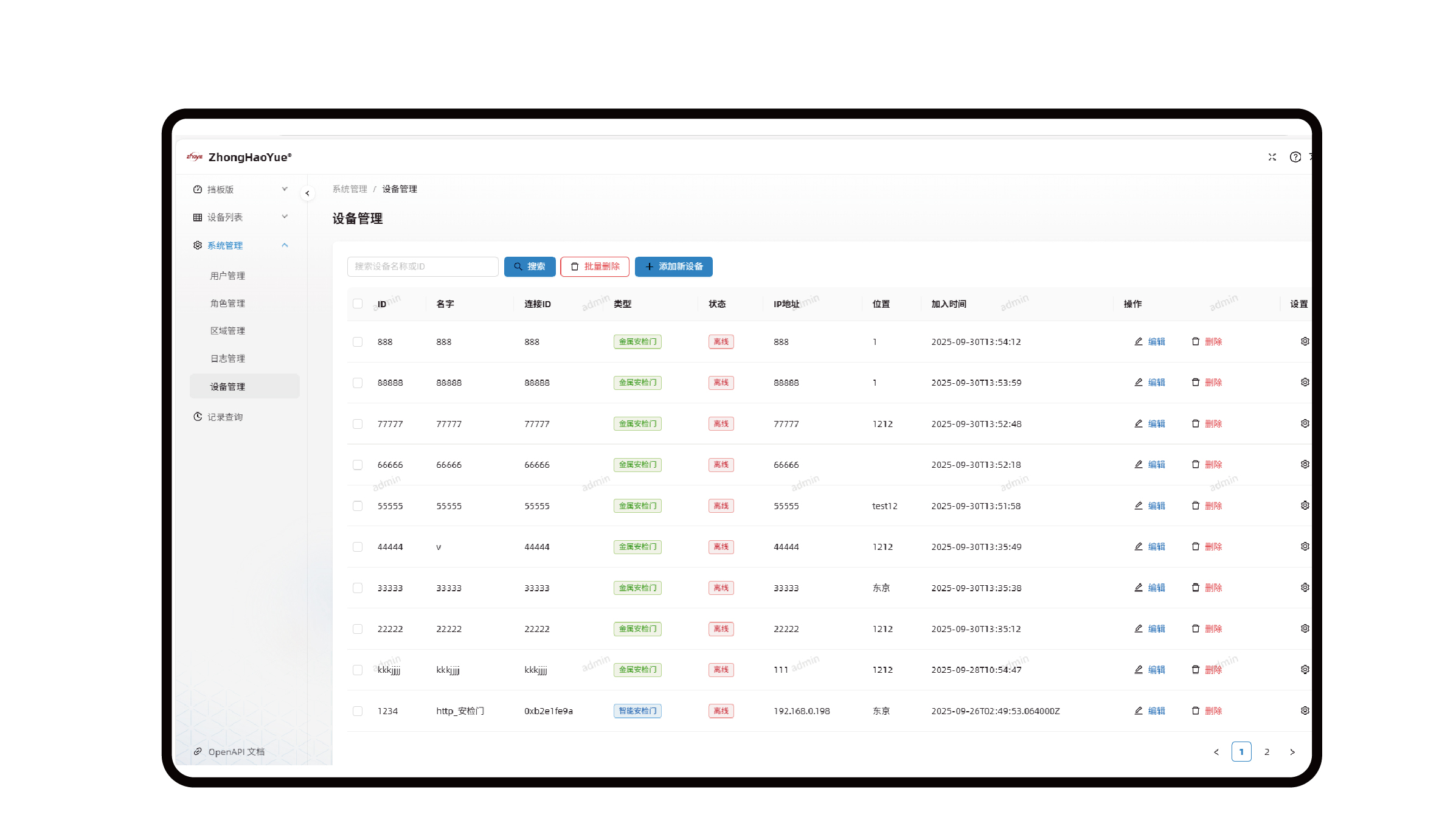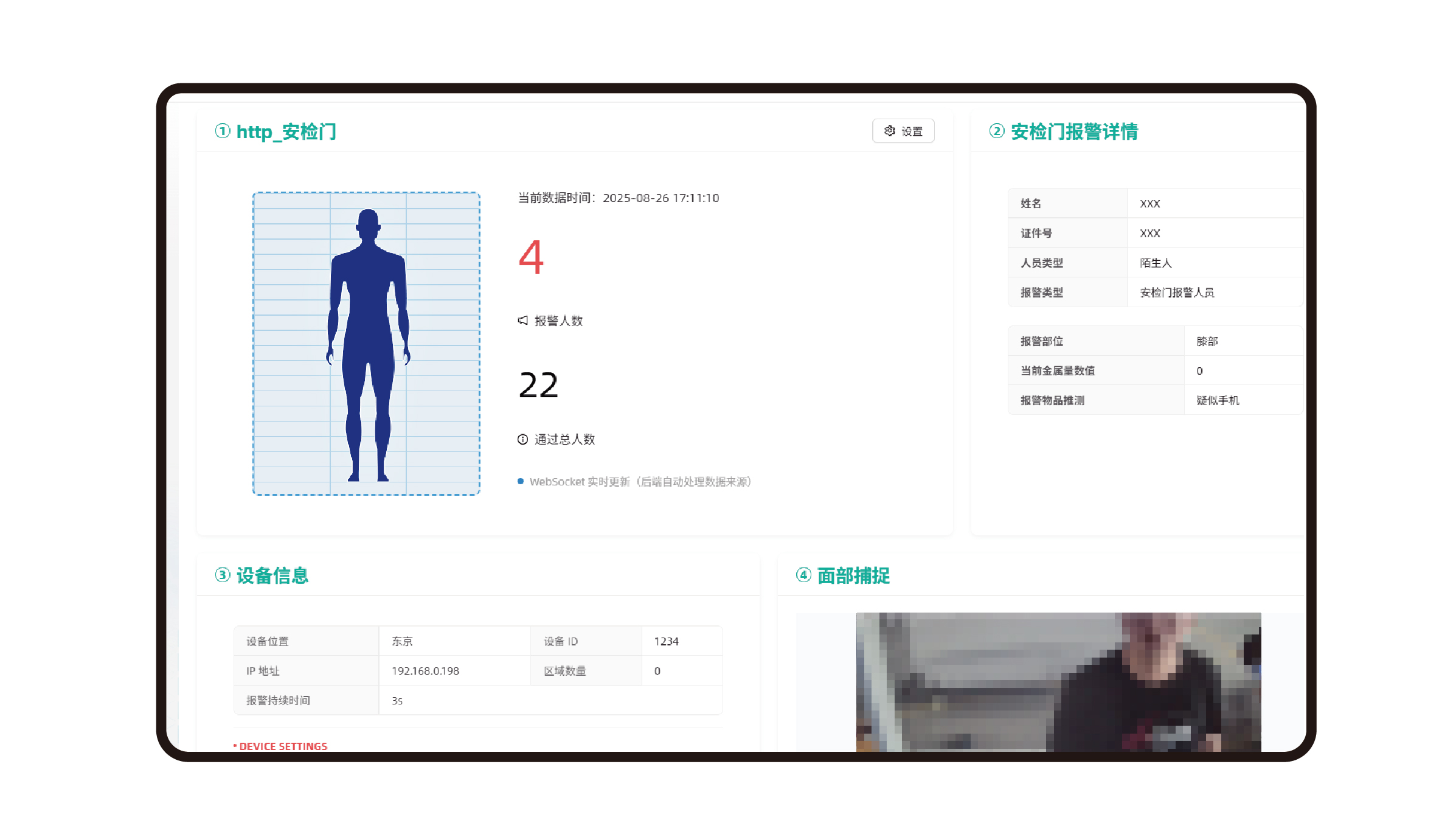 系統涵蓋多個核心模塊:通過安檢數據可視化大屏實現多維度數據(告警態勢、設備狀態等)的直觀呈現;依托安檢機、安檢門實時監測模塊,支持過包圖像解析、違禁品識別、人員安檢數據實時統計與詳情展示;借助多設備實時數據概覽模塊實現多類型設備狀態與業務數據的集中化聚合管理;同時,通過用戶管理、角色管理實現精細化權限管控,通過區域管理提供基礎數據支撐,通過日志管理保障操作可追溯,通過設備管理實現安檢設備全生命周期管控,通過告警記錄查詢支持歷史告警的多維度篩選與追溯分析。